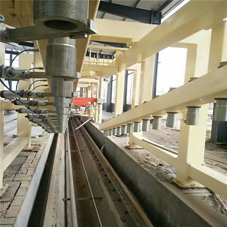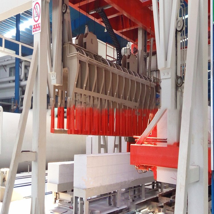 澆注后模具用輸送鏈推入初養(yǎng)室進(jìn)行發(fā)氣初凝,室溫為50~70℃,初養(yǎng)時(shí)間為1.5-2小時(shí)(根據(jù)地理有利條件,可免去此工藝),初養(yǎng)后用負(fù)壓吊具將??蚣芭黧w一同吊到預(yù)先放好釜底板的切割臺(tái)上.脫去???切割機(jī)即對(duì)坯體進(jìn)行橫切、縱切、銑面包頭,模框吊回到運(yùn)模車上人工清理和除油,然后吊到模車上組模進(jìn)行下一次澆注,切好后的坯體連同釜底板用天車吊到釜車上碼放兩層,層間有四個(gè)支撐,若干個(gè)釜車編為一組。 切割時(shí)產(chǎn)生的坯體邊角廢料,經(jīng)螺旋輸送機(jī)送到切割機(jī)旁的廢漿攪袢機(jī)中,加水制成廢料漿,待配料時(shí)使用。