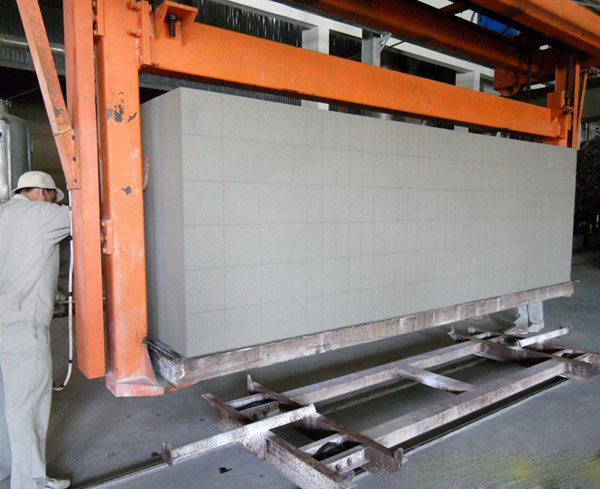 切好后將坯體用移動(dòng)機(jī)連同底板移至蒸養(yǎng)小車。然后編入蒸壓釜中。