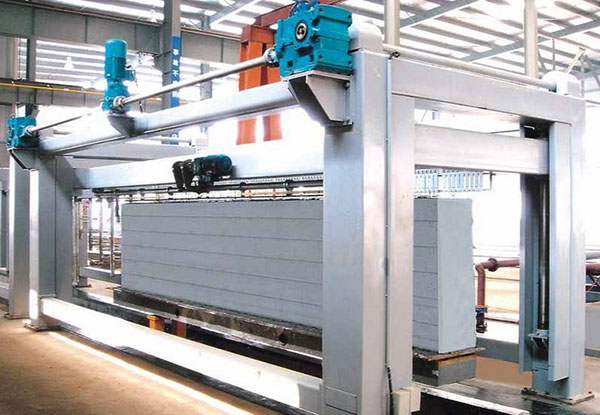依次進(jìn)行垂直切割、縱向切割、水平切割、橫向切割及側(cè)刀切割。切好后將坯體用移動(dòng)機(jī)連同底板移至蒸養(yǎng)小車。然后編入蒸壓釜中。在蒸壓釜中進(jìn)行高溫蒸養(yǎng),蒸養(yǎng)好后就可以出釜,這時(shí)已經(jīng)成為成品啦。把這些成品用吊具小心的堆成垛或者裝車、打包送走都可以,然后就是把蒸養(yǎng)側(cè)板折返就完成了整個(gè)加氣塊設(shè)備的所有工作。