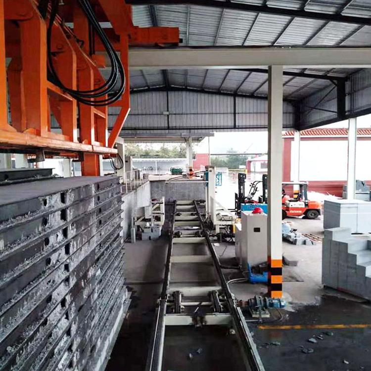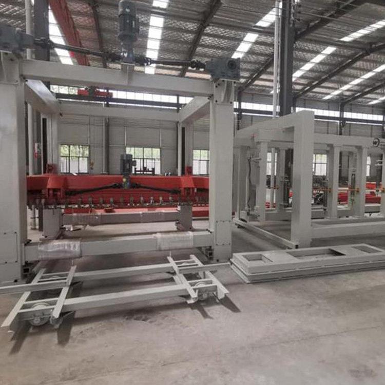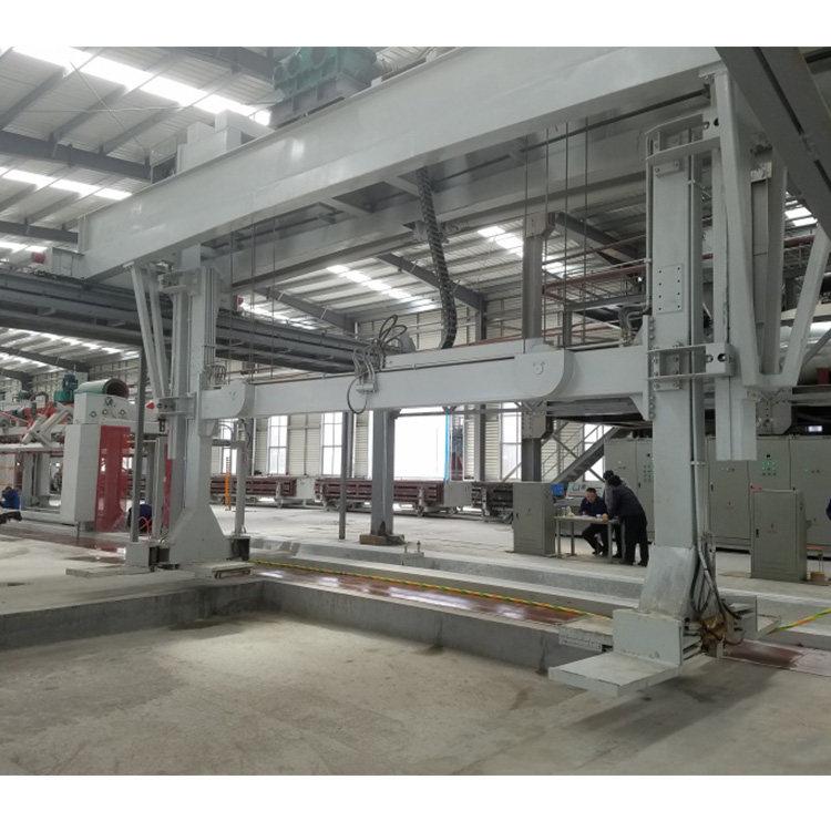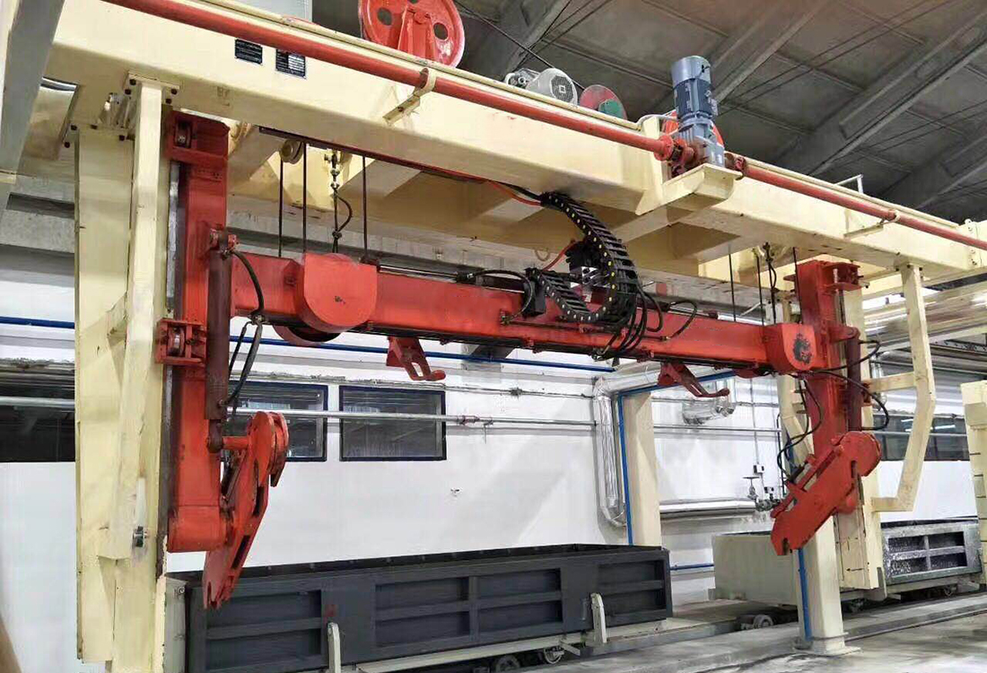 翻轉(zhuǎn)吊具將坯體(帶模具、側(cè)板)在空中翻轉(zhuǎn)90度,吊具放在切割臺(tái)或切割小車上,脫去???,坯體即能切割。