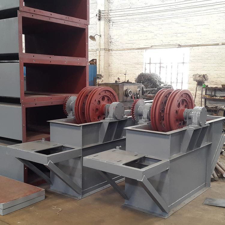 4、鏈條及料斗:鏈條為圓鋼焊接環(huán)鏈。料斗用螺母定在鏈條的接頭上。不同高度的斗提機(jī)現(xiàn)套相應(yīng)數(shù)量的鏈條、接頭、及料斗。