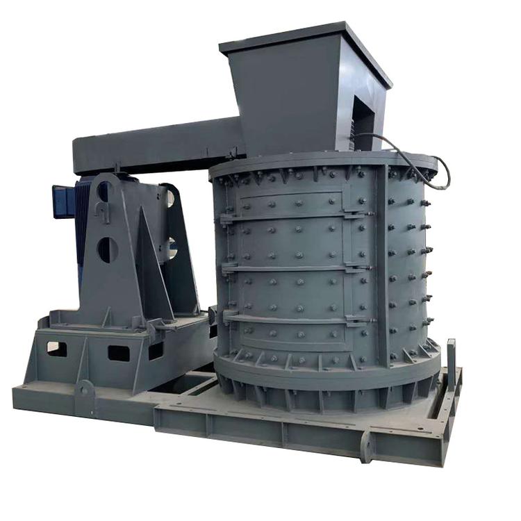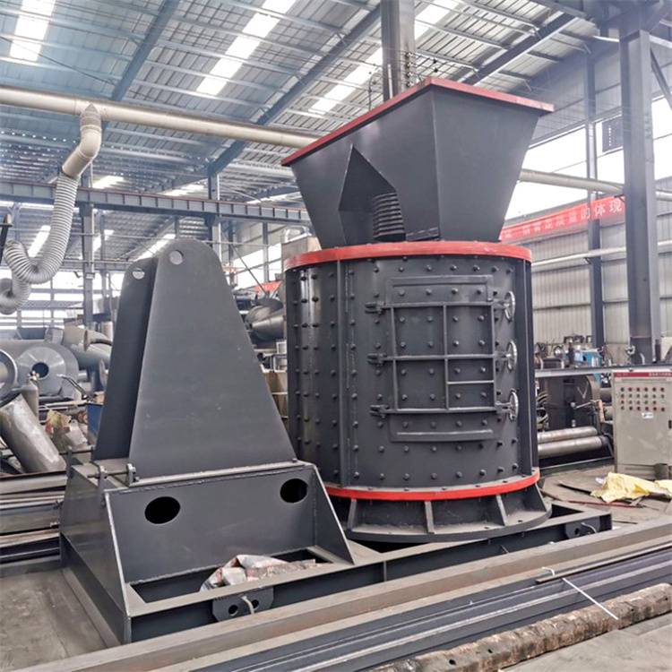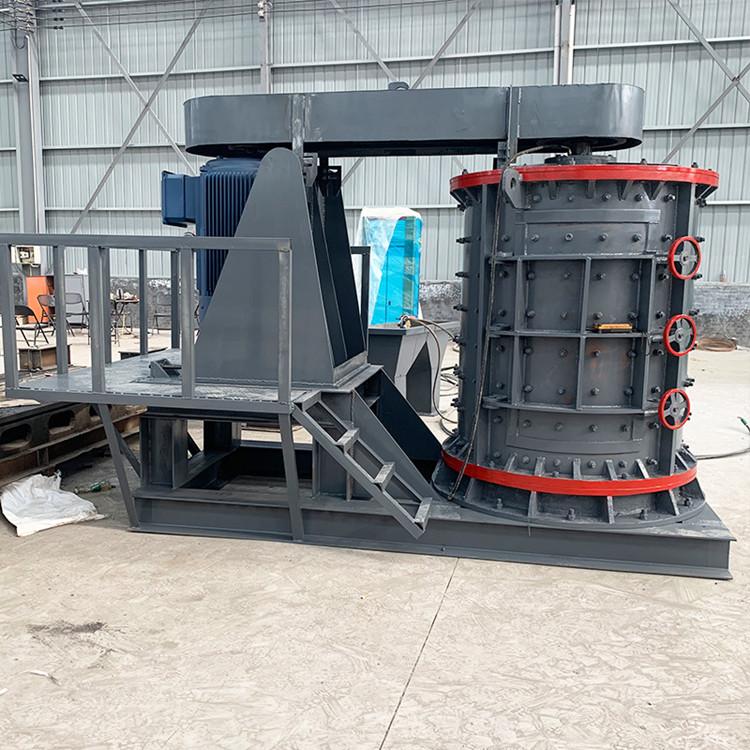 物料由復(fù)合破上部垂直落入高速旋轉(zhuǎn)的葉輪內(nèi),在高速離心力的作用下,與另一部分以傘狀形式分流在葉輪四周的物料產(chǎn)生高速撞擊與粉碎,物料在互相撞擊后,又會(huì)在葉輪和機(jī)殼之間以物料形成渦流多次的互相撞擊、摩擦而粉碎,從下部直通排出,形成閉路多次循環(huán),由篩分設(shè)備控制達(dá)到所要求的成品粒度。